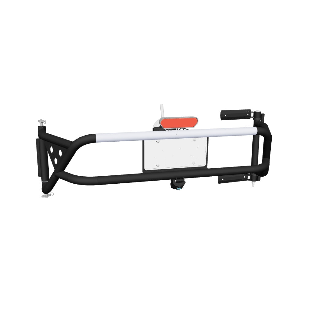 The swing-out design allows the tire carrier to open and close with the tailgate as a single assembly, providing quick, one-handed access to your spare tire. The hinge side assembly includes polyurethane bushings for rattle-free operation, while the latch side assembly utilizes top and bottom quick-release pins for secure, reliable closure. An integrated center-mount license plate bracket includes a license plate light, and the carrier features a complete CHMSL (center high mount stop light) system with stop, running, reverse, and chase light functionality.